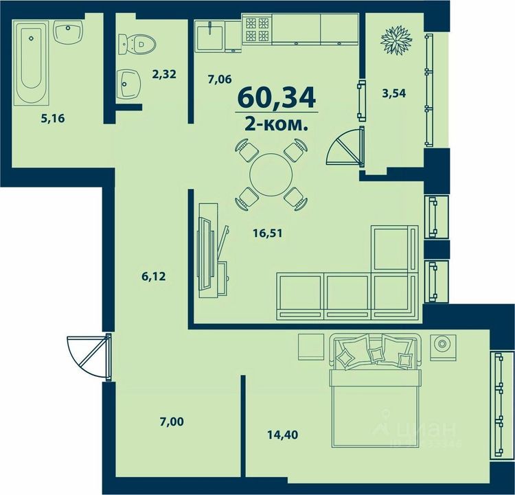 2-к. квартира 60.34 м²